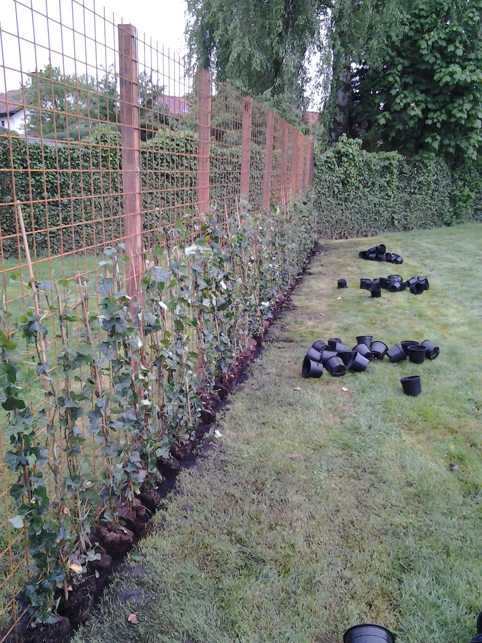Voorbeelden van aanleg erfafscheiding zoals bijvoorbeeld betongaas met hedera.